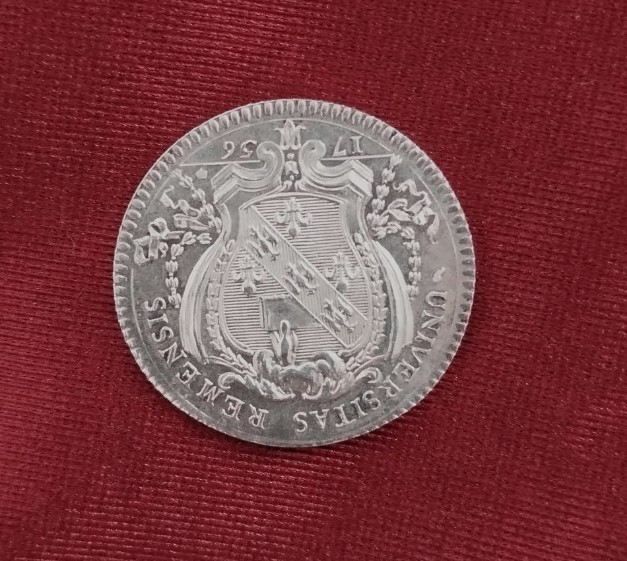 Stříbrná mince Univerzity Reims s portrétem Cardinala Charlese of Lorraine. Průměr: 31 mm.