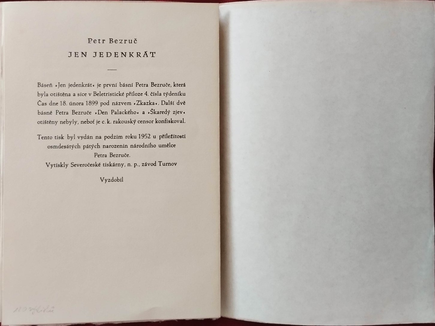 Tisk básně Jen jedenkrát od Petra Bezruče vyšel v roce 1952 k 85. narozeninám básníka. Vydaly Severočeské tiskárny, n. p., závod Turnov.