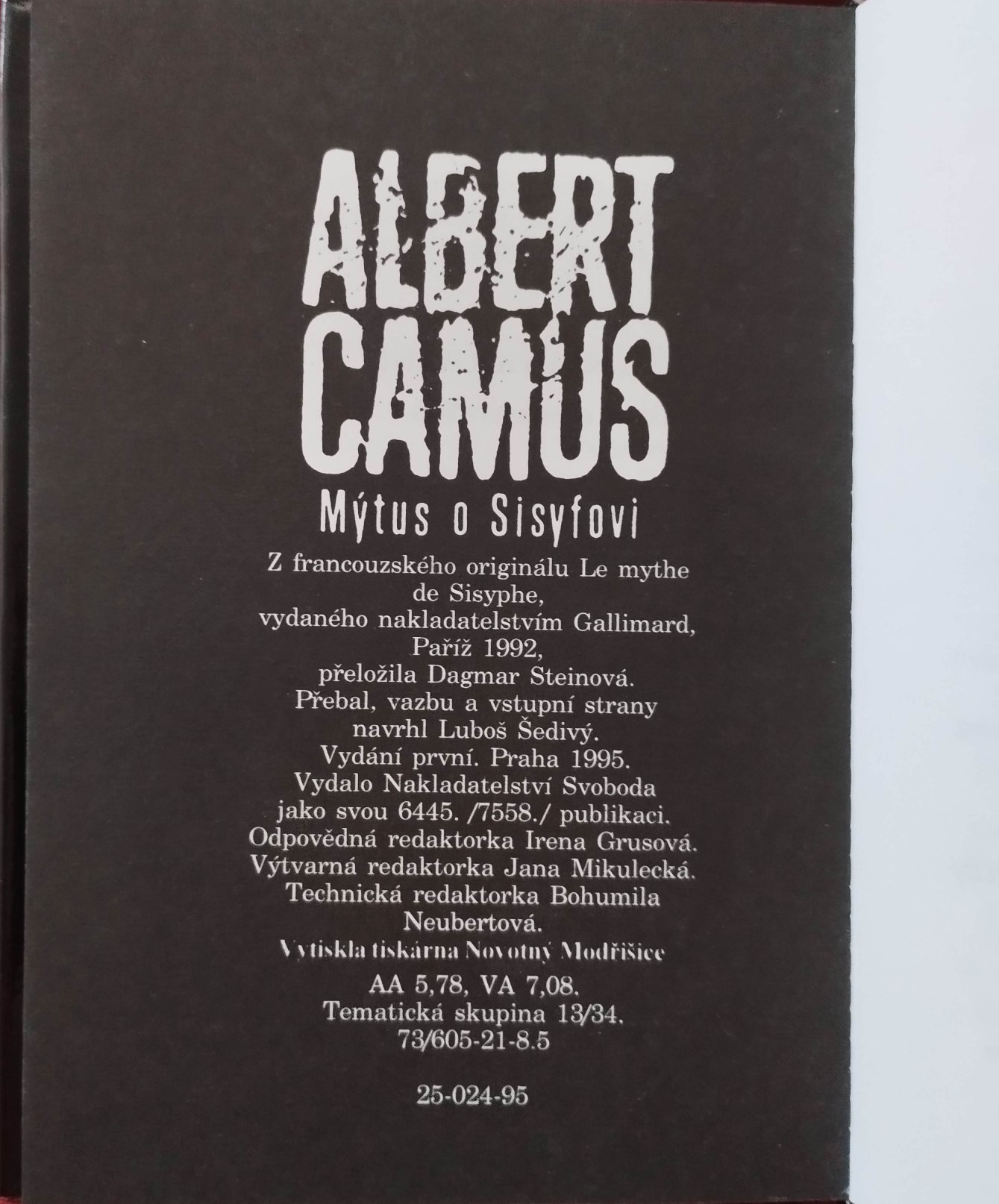 Kniha Mýtus o Sisyfovi od francouzského filozofa Alberta Camuse je zásadním textem existencialismu a absurdismu. Vydalo: nakladatelství Svoboda, Praha 1995. Počet stran: 186, rozměr: 17,5 x 12 cm.