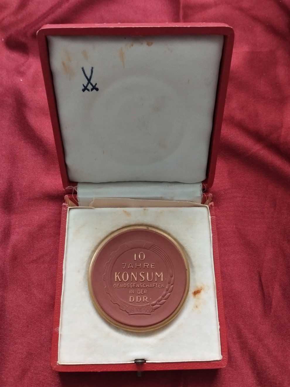 Keramická medaile připomínající 10. výročí založení spotřebních družstev (Konsumgenossenschaften) ve východním Německu. Datum 18. 11. 1955.