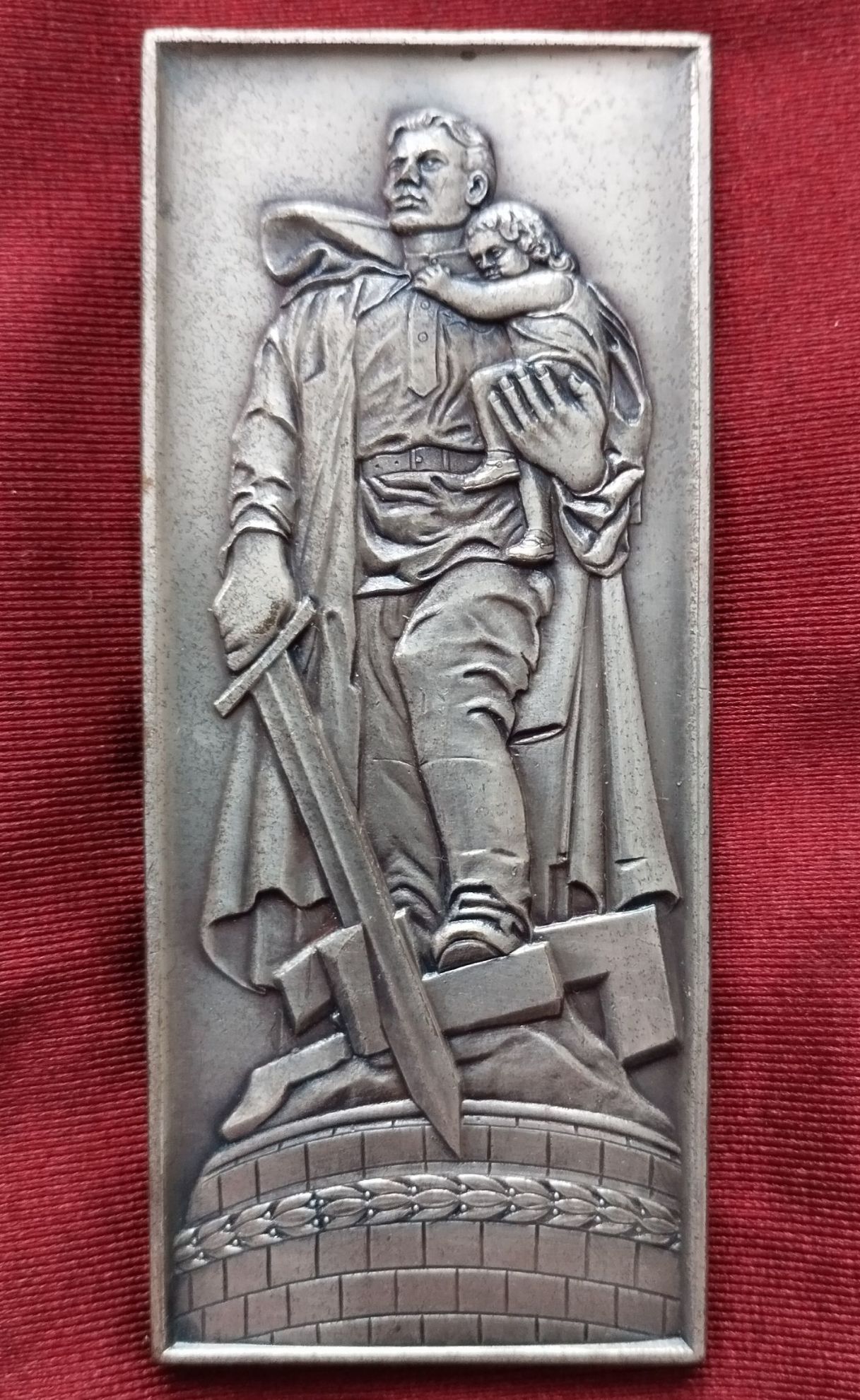 Kovová plaketa zobrazující Památník sovětských válečných hrdinů v Treptower Parku v Berlíně. Plaketa zobrazuje sovětského vojáka držícího dítě a mečem ničícího nacistický hákový kříž. Materiál: kovová slitina, rozměr: 9,5 x 4 cm.