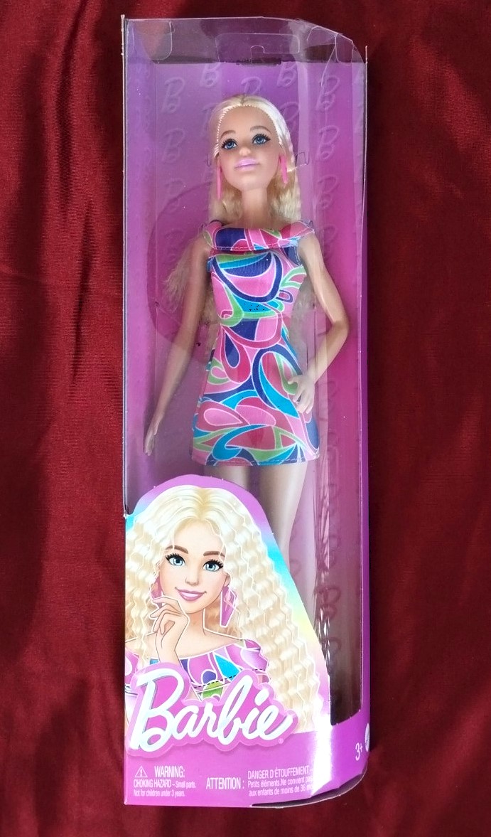 Panenka s pestrobarevnými šaty s grafickým potiskem. Součástí balení jsou zářivě růžové náušnice a růžové boty na podpatku.