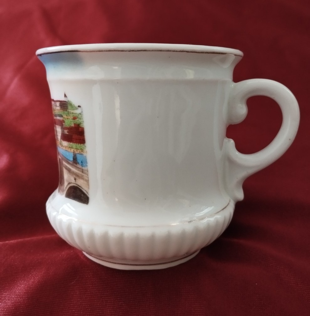Porcelánový hrnek, tzv. "mušlák" cca z první poloviny 20 stol. který sloužil jako suvenýr z Prahy.