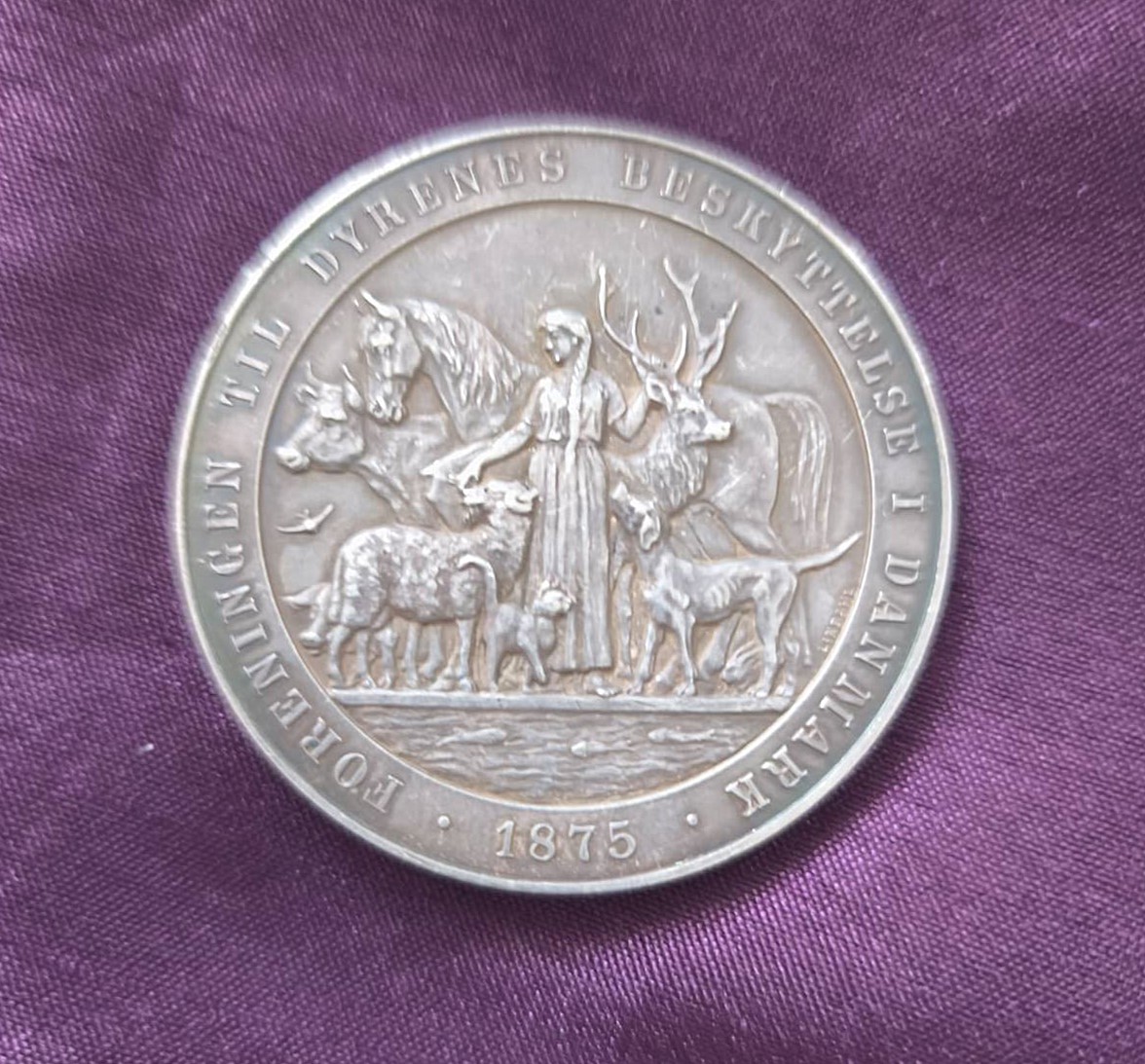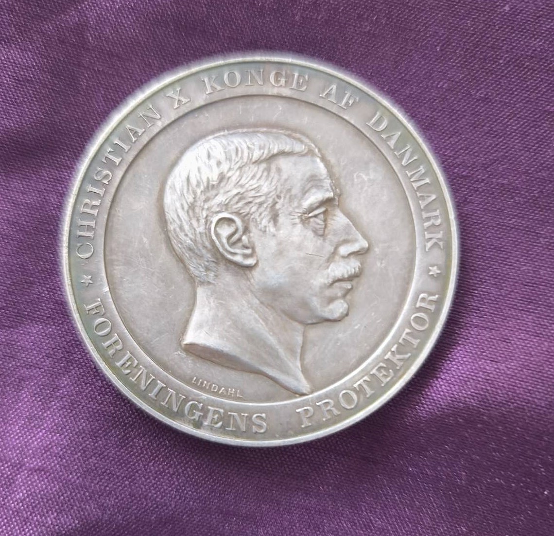 Stříbrná pamětní medaile na počest krále dánského krále Kristiána X. Rok: 1875. Na medaili je nápis "CHRISTIAN X KONGE AF DANMARK FORENINGENS PROTEKTOR" (Kristián X., král dánský, ochránce spolku).