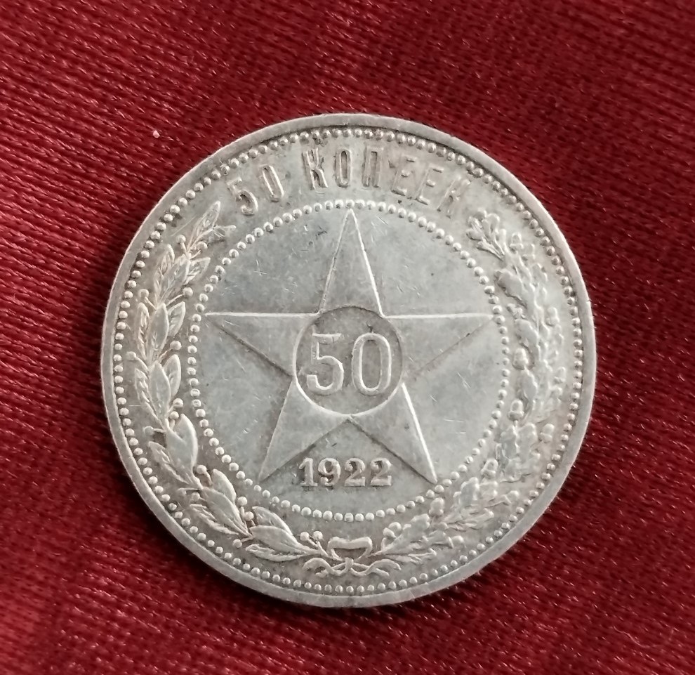 Stříbrná mince o hodnotě 50 kopějek z roku 1922, kterou vydala Ruská sovětská federativní socialistická republika.