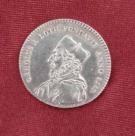 Stříbrná mince Univerzity Reims s portrétem Cardinala Charlese of Lorraine. Průměr: 31 mm.