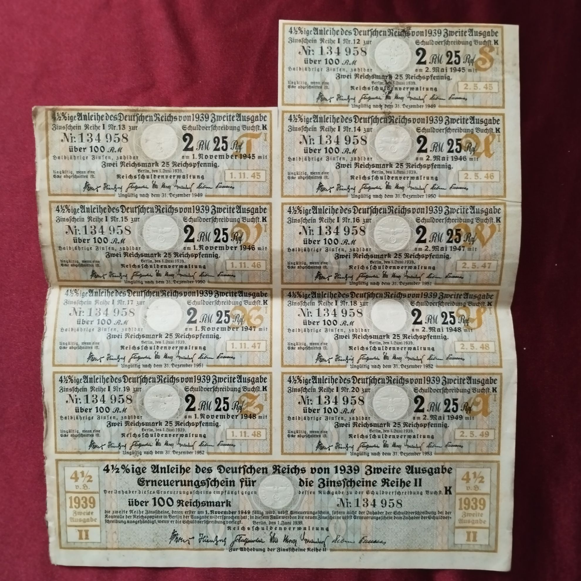 Obsahuje kompletní sadu úrokových kupónů (1945–1949).