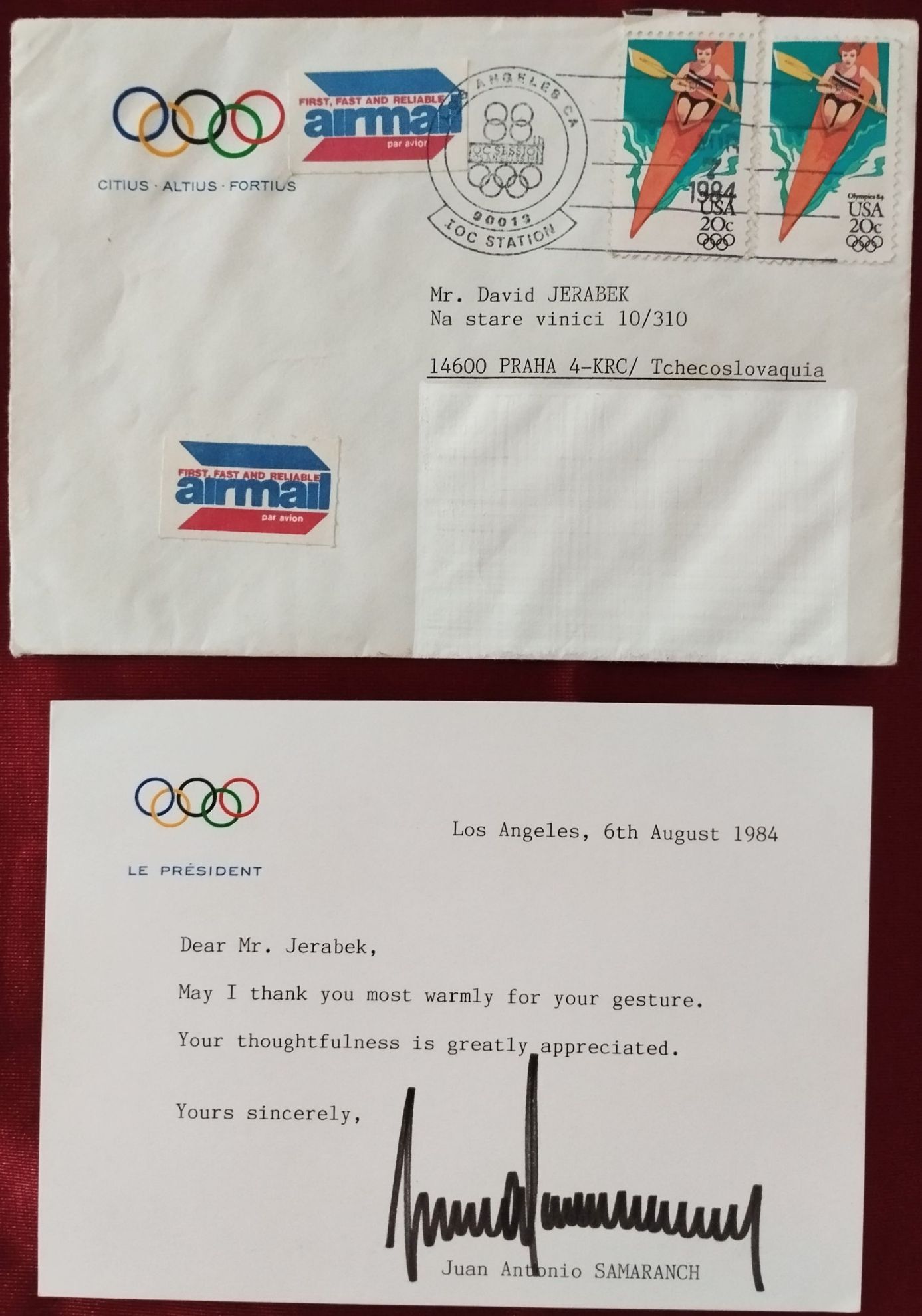 Oficiální dopis z Olympiády 1984 v Los Angeles s originální podpisem předsedy mezinárodního olympijského výboru Juana Antonia Samaranche. Včetně obálky.
