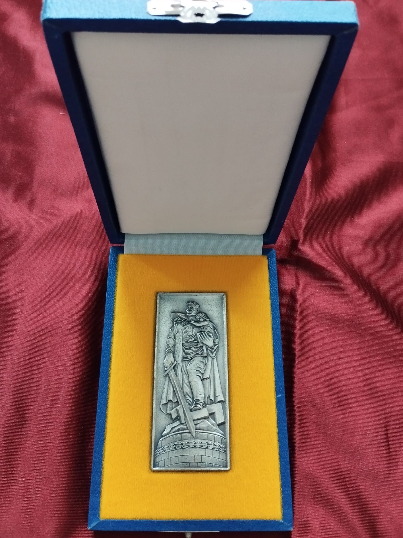 Kovová plaketa zobrazující Památník sovětských válečných hrdinů v Treptower Parku v Berlíně. Plaketa zobrazuje sovětského vojáka držícího dítě a mečem ničícího nacistický hákový kříž. Materiál: kovová slitina, rozměr: 9,5 x 4 cm.